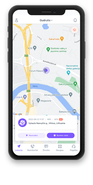 Trackino programėlej galėsite stebėti vaiko preliminarią buvimo vietą bei nustatyti geo tvorą. Jei mažasis ją peržengs, gausite apie tai pranešimą telefone.